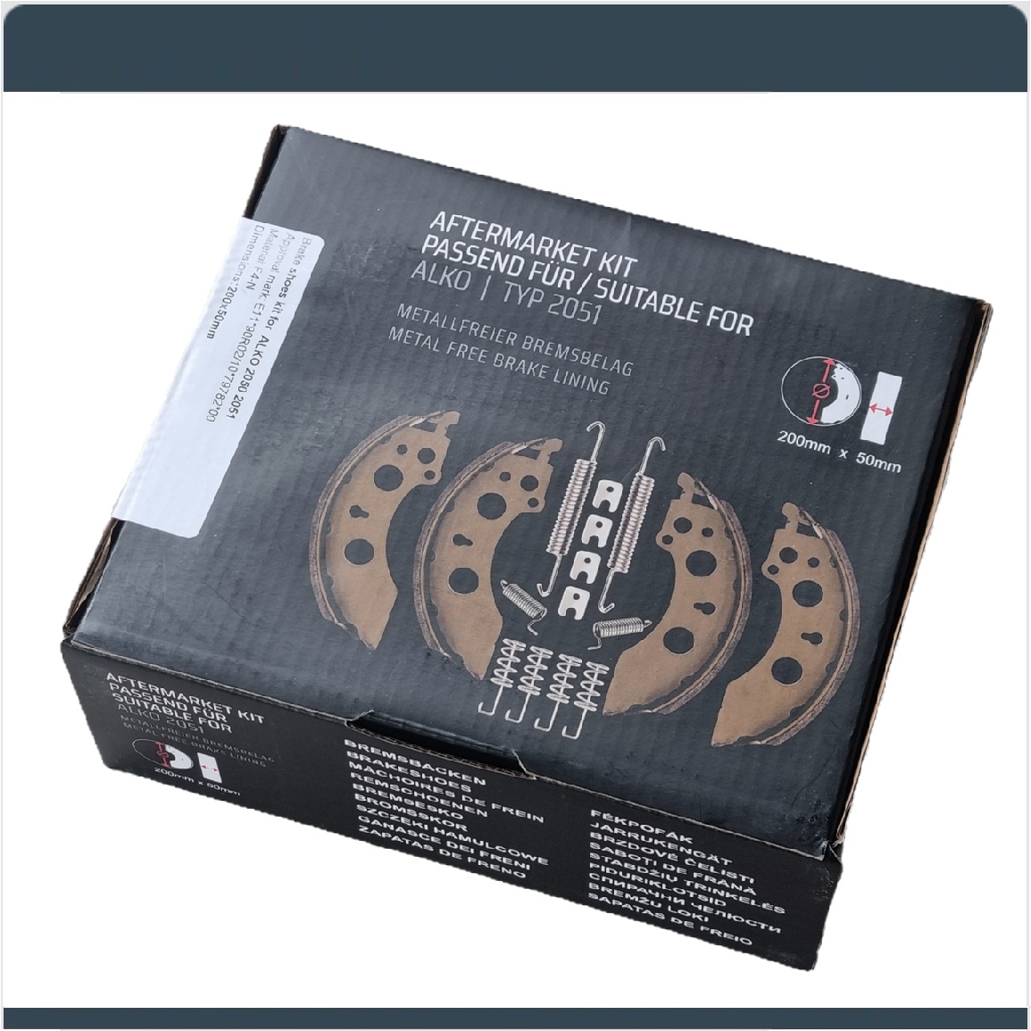 Dieser NB PARTS Bremsbacken Achssatz 200 × 50 mm ist ein hochwertiges Bremsen Kit für AL-KO Anhängerbremsen und eignet sich ideal für Wartung, Reparatur oder den Austausch verschlissener Bremsbacken bei PKW-Anhängern und Wohnwagen.